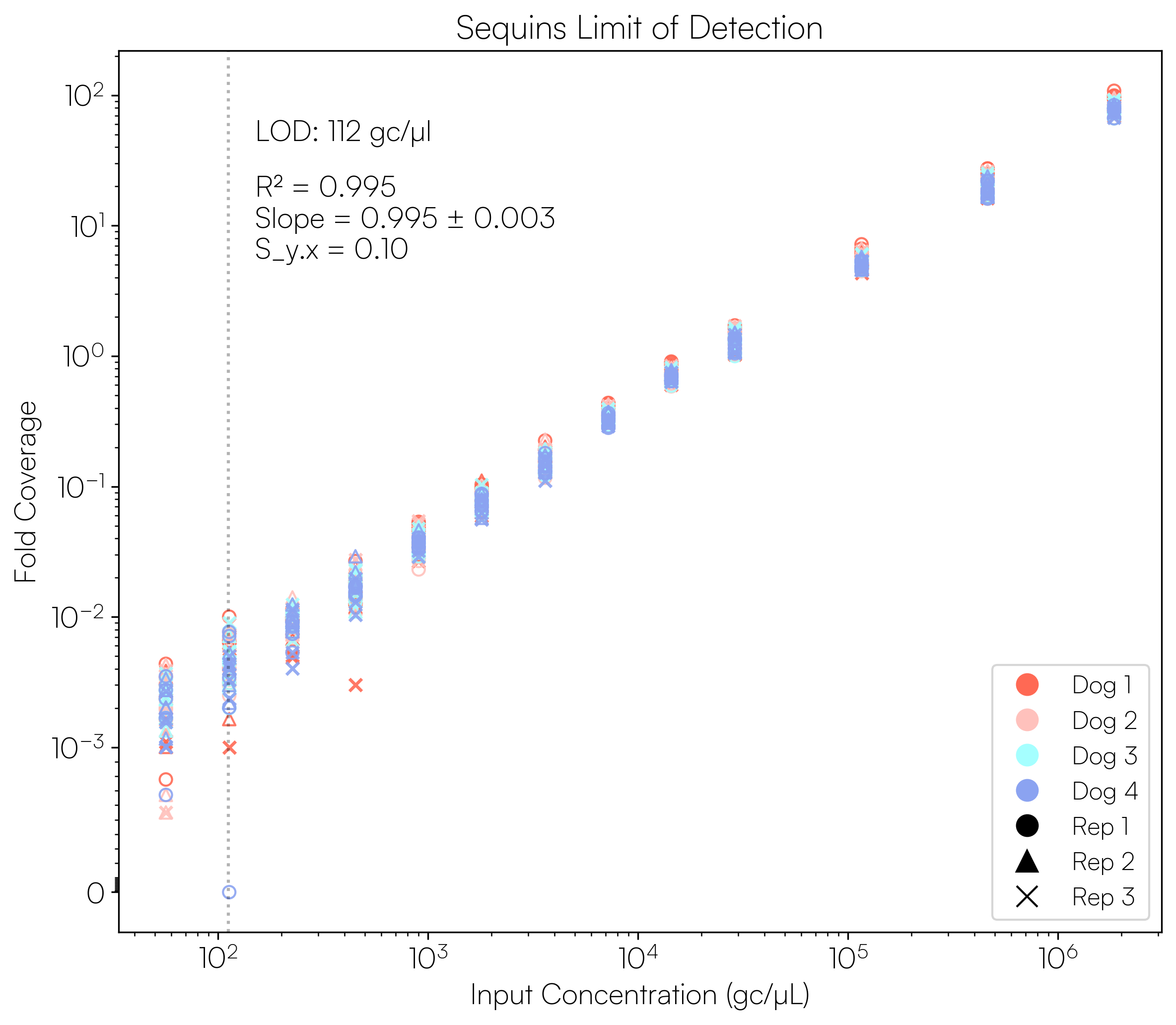 Scatter plot of theoretical fold coverage (x) vs. limit of detection (LOD) (y) for GCUL, with recoloured markers and labeled axes. Scatter plot comparing predicted NGUL (y) vs theoretical NGUL (x) for a DNA standard (Sequins-only); points are samples, with labeled axes and legend.