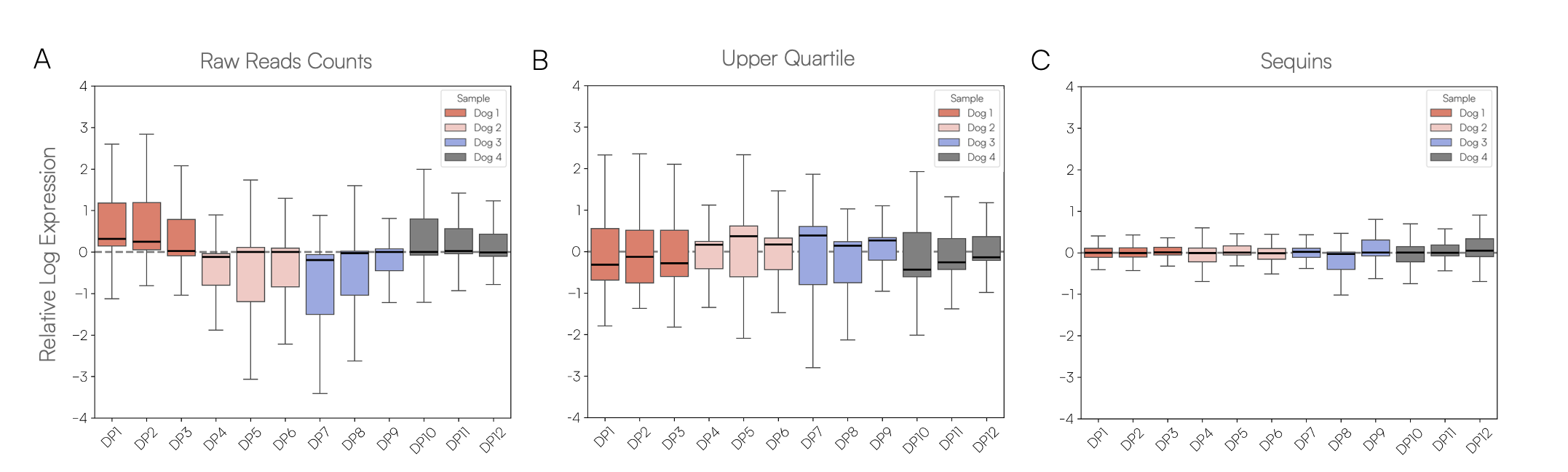 Sequins provide superior normalization performance. Relative Log Expression (RLE) normalization using (A) raw reads counts, (B) upper quartile and (C) Sequins. Faecal samples collected from Dogs 1 to 4, each with three corresponding replicates (DP1-DP12). Sequins-based normalization showed the most pronounced improvements. This included a tighter distribution centred around zero and reduced inter-sample variation. All results are based on phylum-level abundance estimates from Kraken 2/Bracken.
